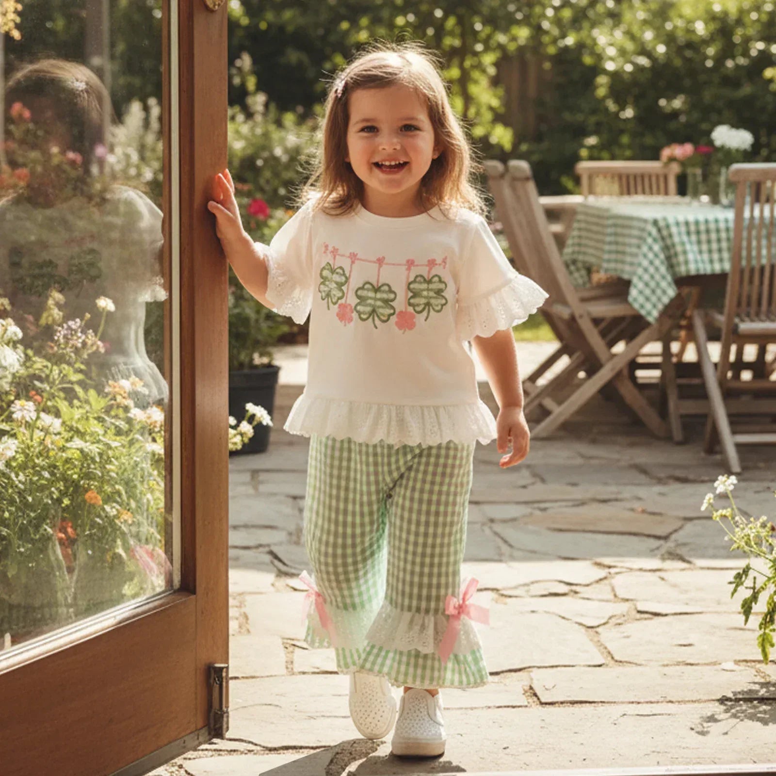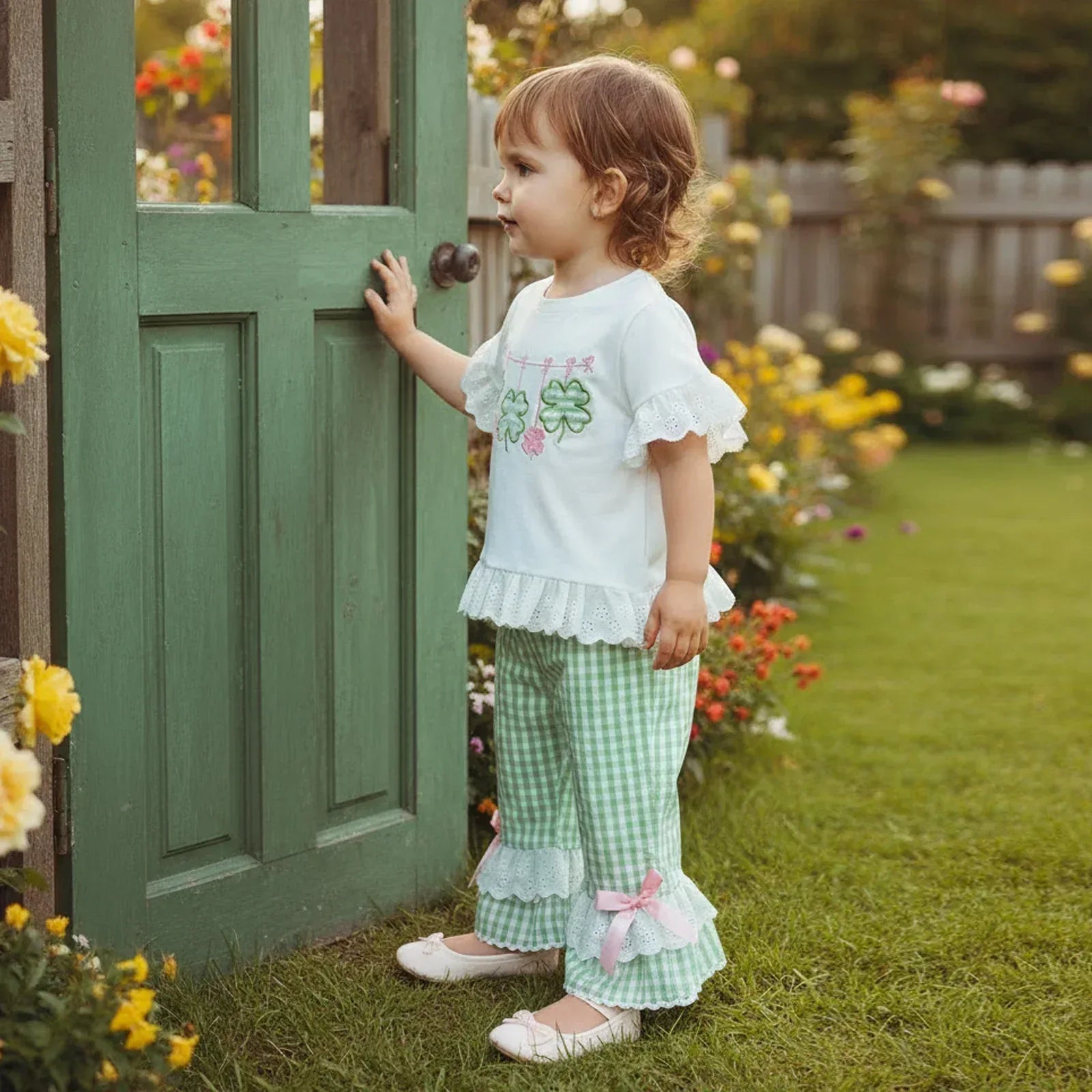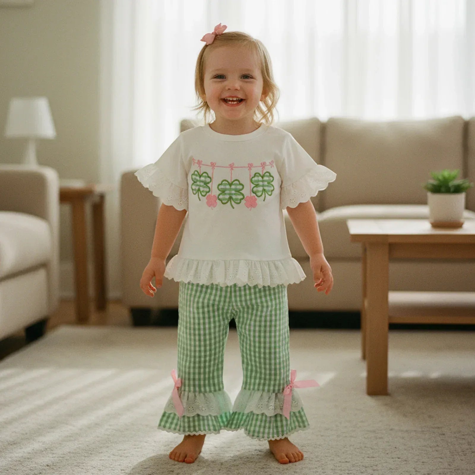 Get your little one ready for fun with this adorable St Patrick's Day outfit for girls. This 2-piece set includes a comfy top and cute pants. The top has sweet clover prints that bring all the festive vibes. Soft ruffles at the sleeves and hem give the shirt a playful touch. The matching pants feature green gingham checks with pretty bows and flouncy ruffles that make every step extra special.