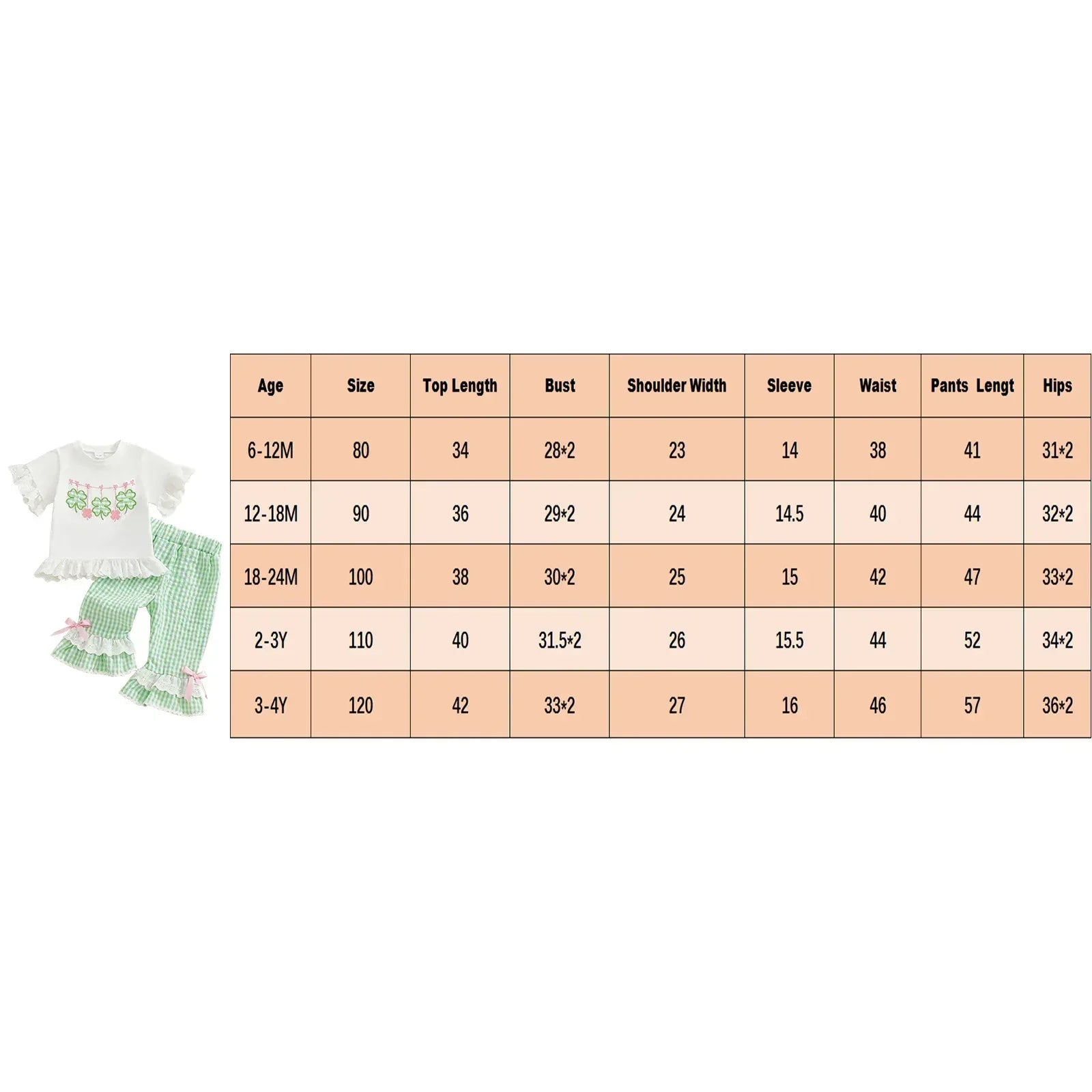 110   Tops Length: 15.7  Bust: 24.8  Shoulder Width: 10.2  Sleeve: 6.1  Waist: 17.3  Pants Length: 20.5  Hips: 26.8  Advised Age: 2-3 Years