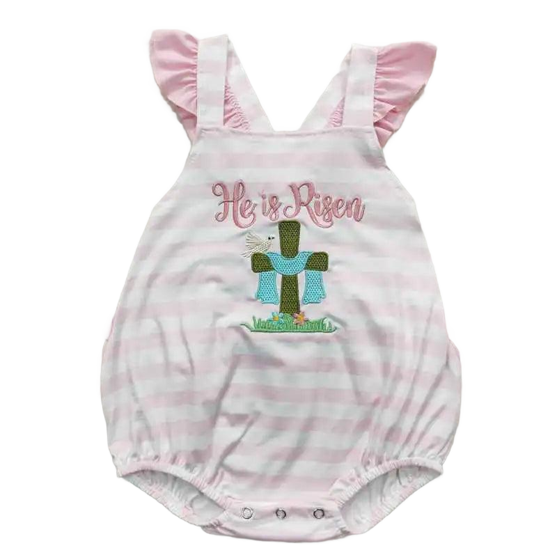 The He Is Risen Baby Romper With Embroidered Cross Detail from The Palm Beach Baby makes a sweet choice for special moments. This romper features soft pastel stripes and a beautiful cross embroidery right on the front. The message "He is Risen" is carefully stitched above for a thoughtful touch.