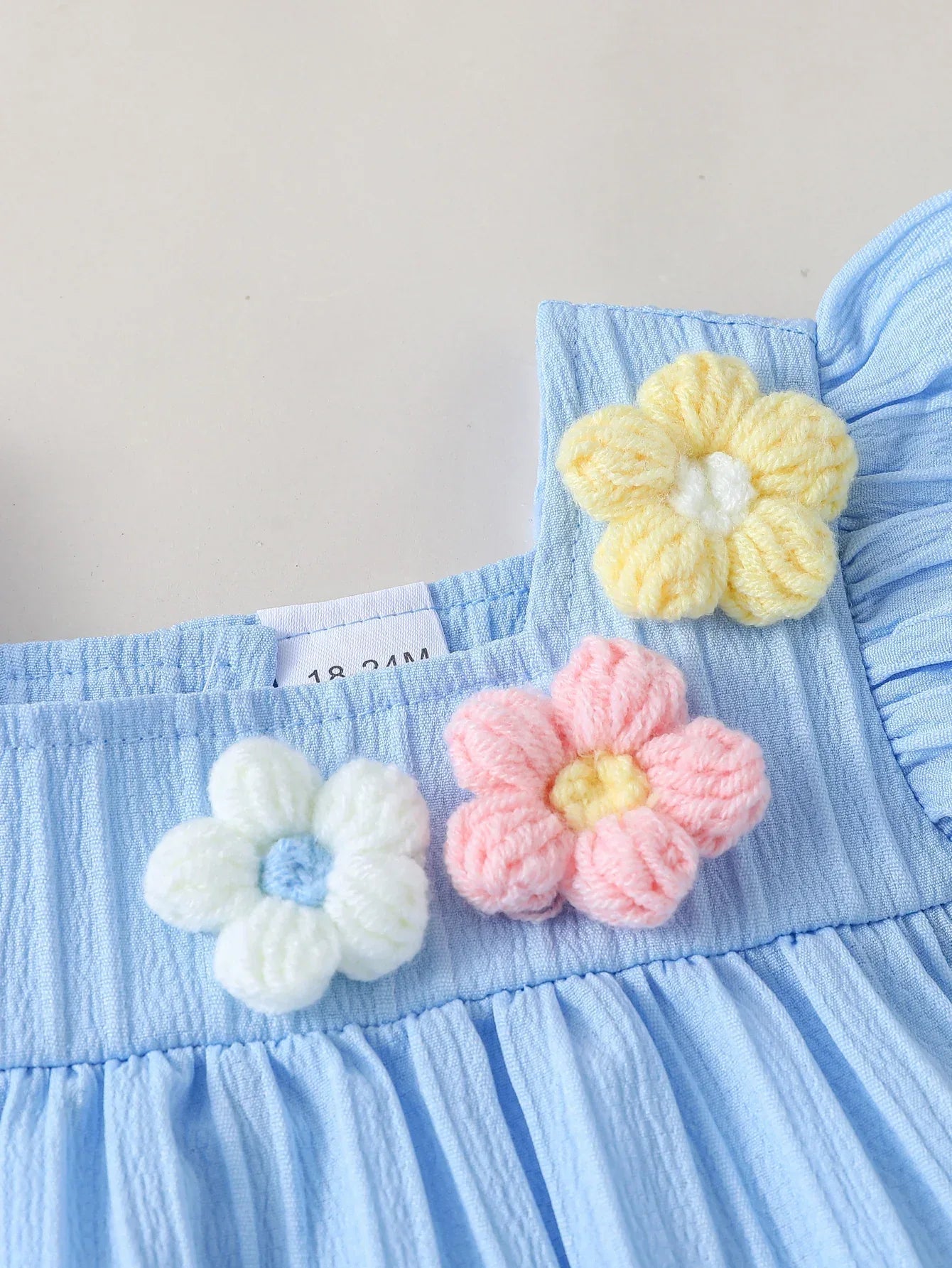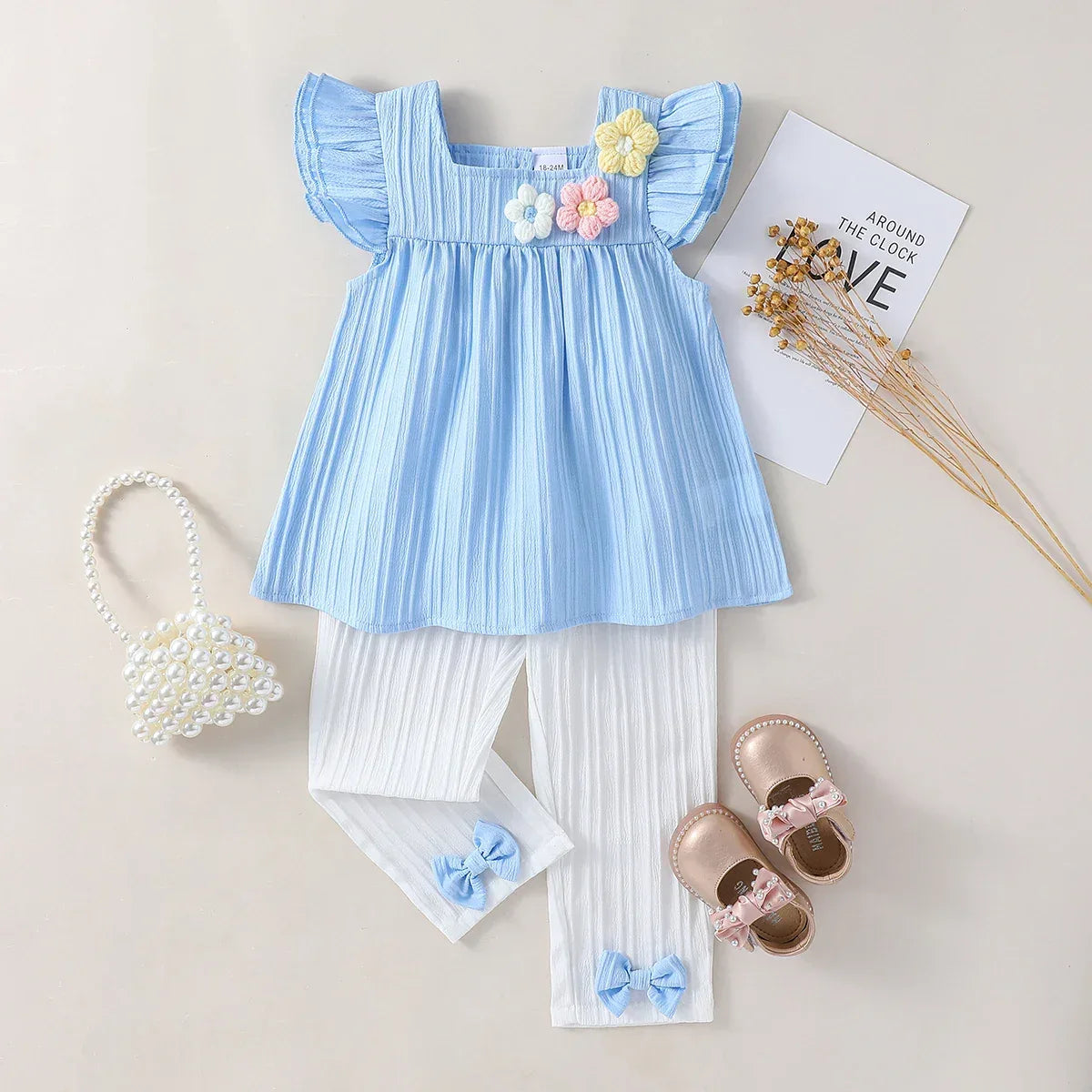 - Charming Aesthetics: Adorned with delightful appliqué flowers and cute blue bows, the light blue top paired with white pants creates an eye-catching ensemble.