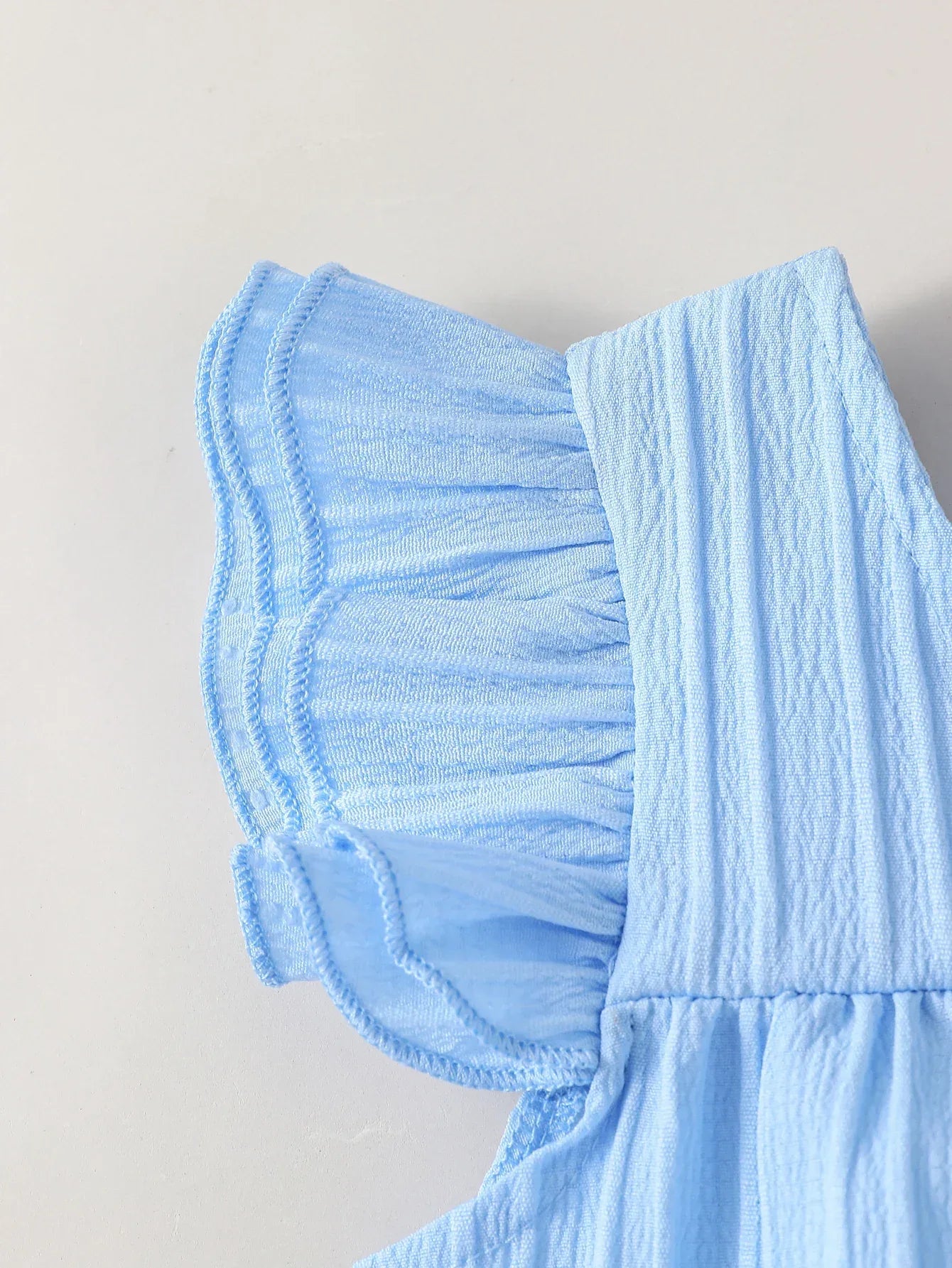 The top flaunts ruffled sleeves that add a playful touch, making it perfect for those sunny summer days. Plus, it comes with a convenient back fastening, making dressing up a breeze. The breathable, wrinkle-resistant polyester fabric means less time ironing and more time playing!