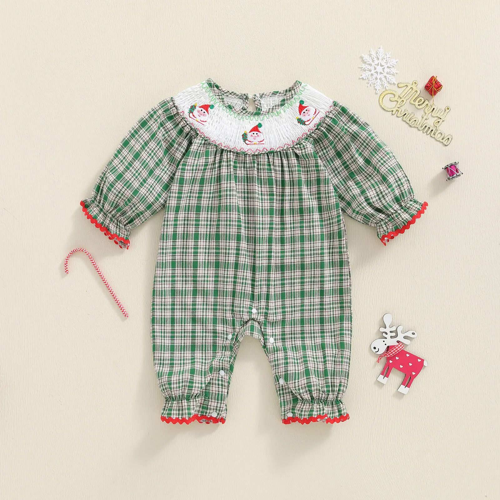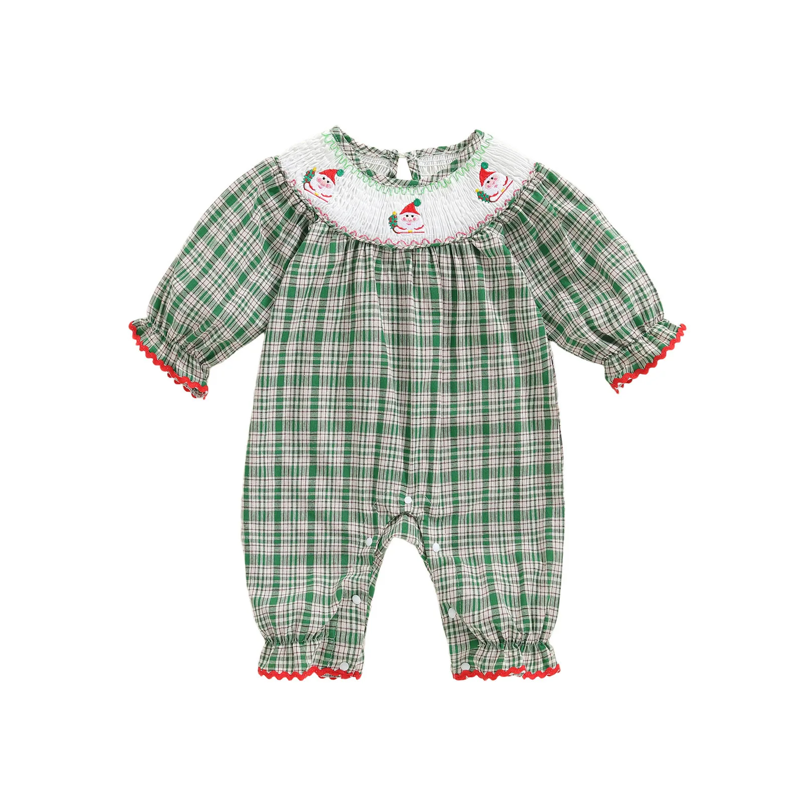 Dress your little one in holiday magic with this delightful "Tartan Santa" smocked long-sleeve bubble romper! Featuring a timeless spruce tartan plaid base adorned with cheerful Santa red accents and embroidered jolly Santas, this charming piece captures the spirit of the season in style. Crafted from soft cotton, the bubble design offers a comfortable, playful silhouette that's perfect for babies who love to move and explore.