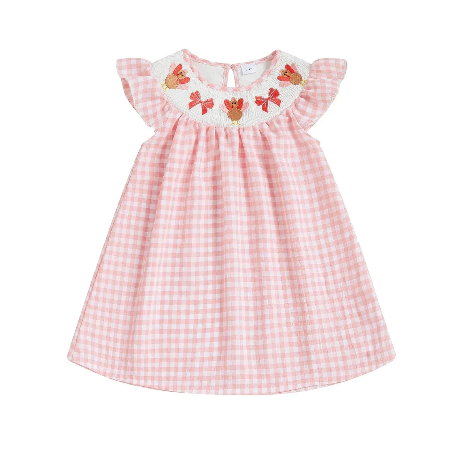 The A-line silhouette allows easy movement. Gentle ruffled sleeves make dressing up effortless. Designed for busy families, this Thanksgiving baby dress is machine washable and keeps its vibrant color after every wash. The back button closure helps with quick changes. This dress is perfect for Thanksgiving gatherings, family photos, or a day out.