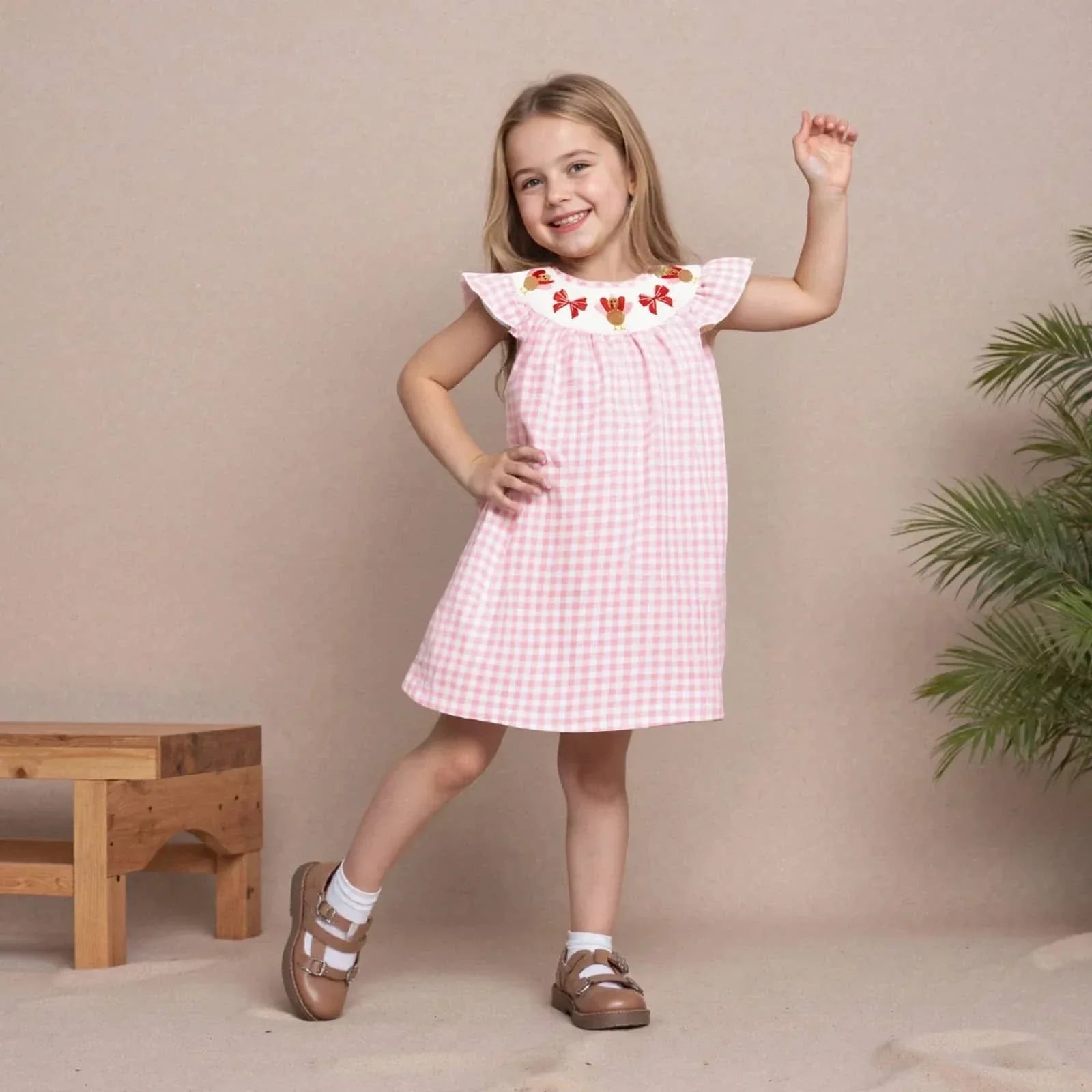 Add a touch of holiday charm with this Thanksgiving Seersucker Embroidered A-line Dress in pink. This Thanksgiving baby dress brings classic style to your little one's wardrobe. The soft seersucker fabric feels light on delicate skin. The embroidered motifs across the neckline have autumn leaves and cheerful bows for a festive look.