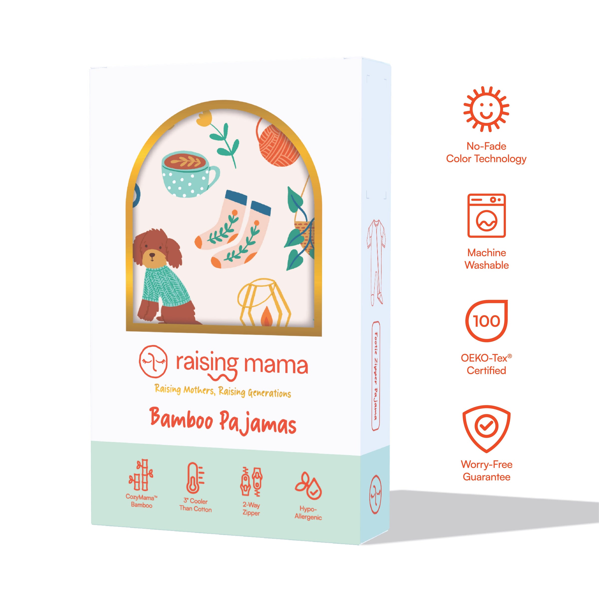 Outfitted with signature Raising Mama® "mama-at-peace" footie grips, this bamboo baby sleeper has elastic backing on the footies for a snug fit, and will hug those baby chubs for extra cozy snuggles.Â