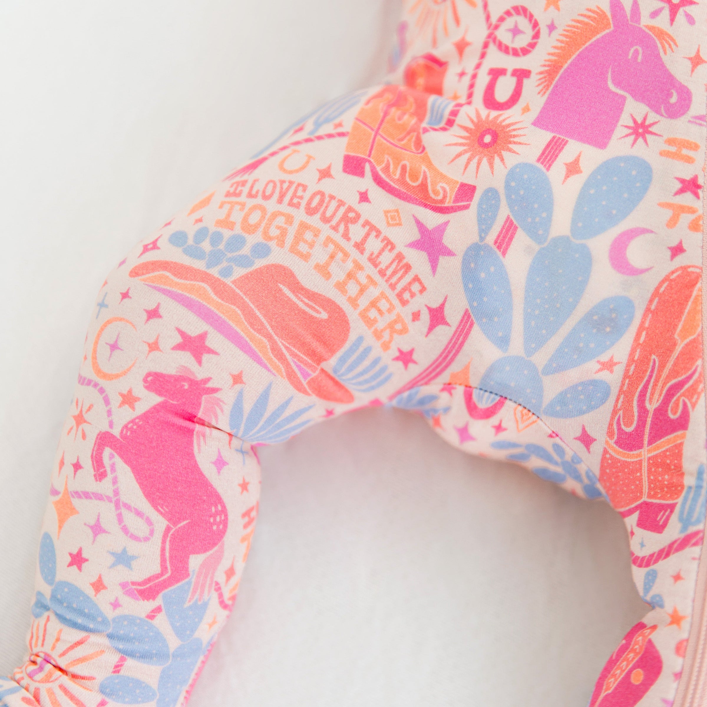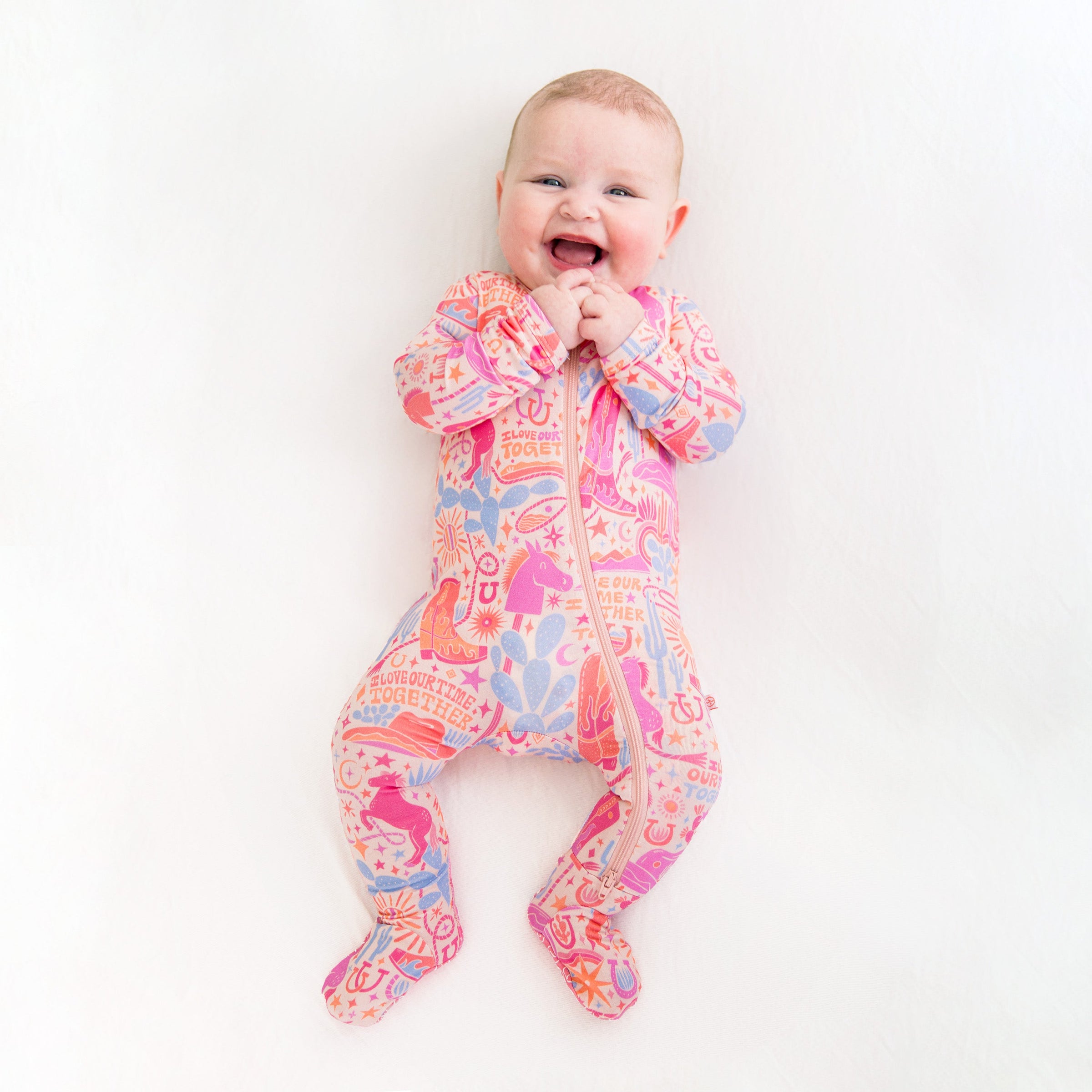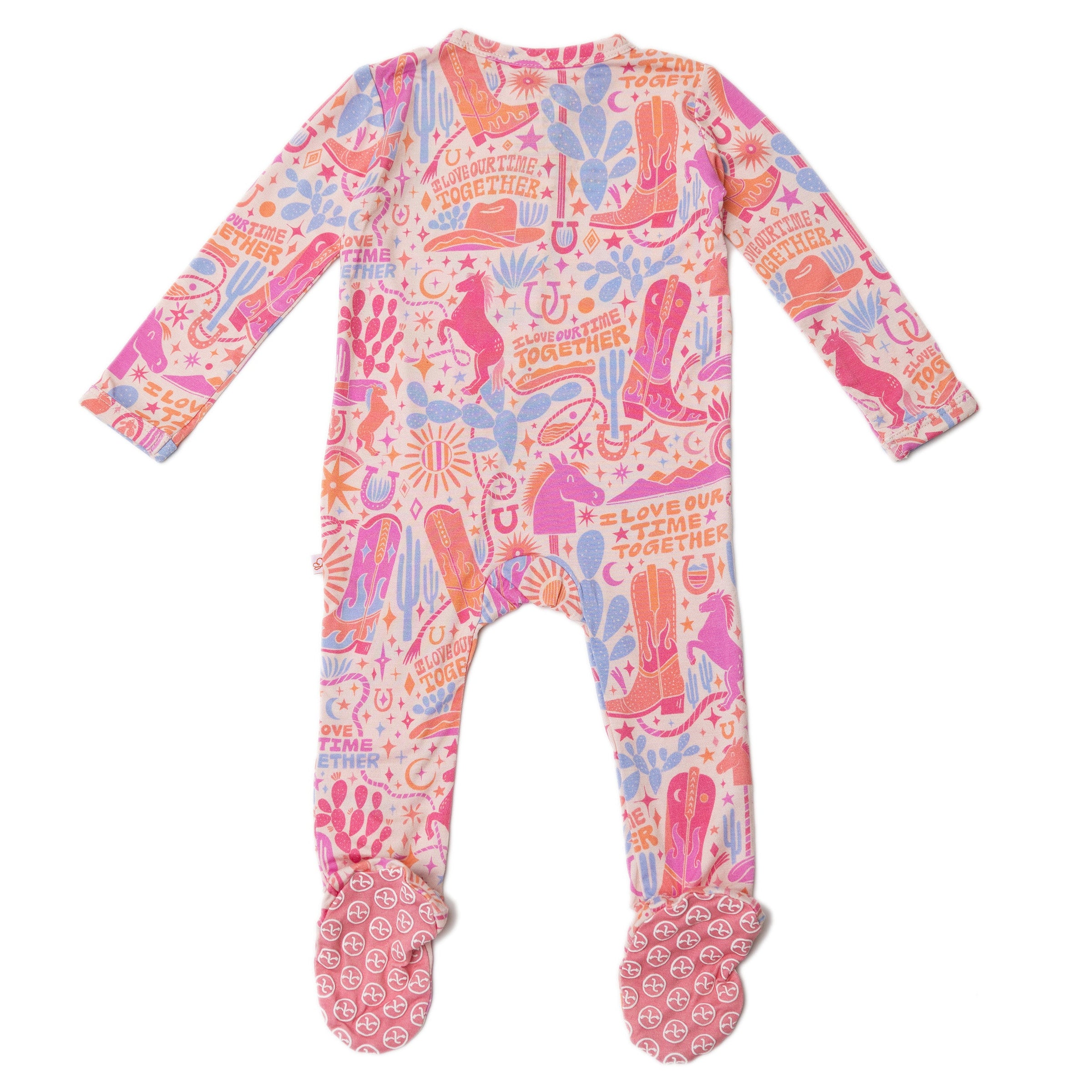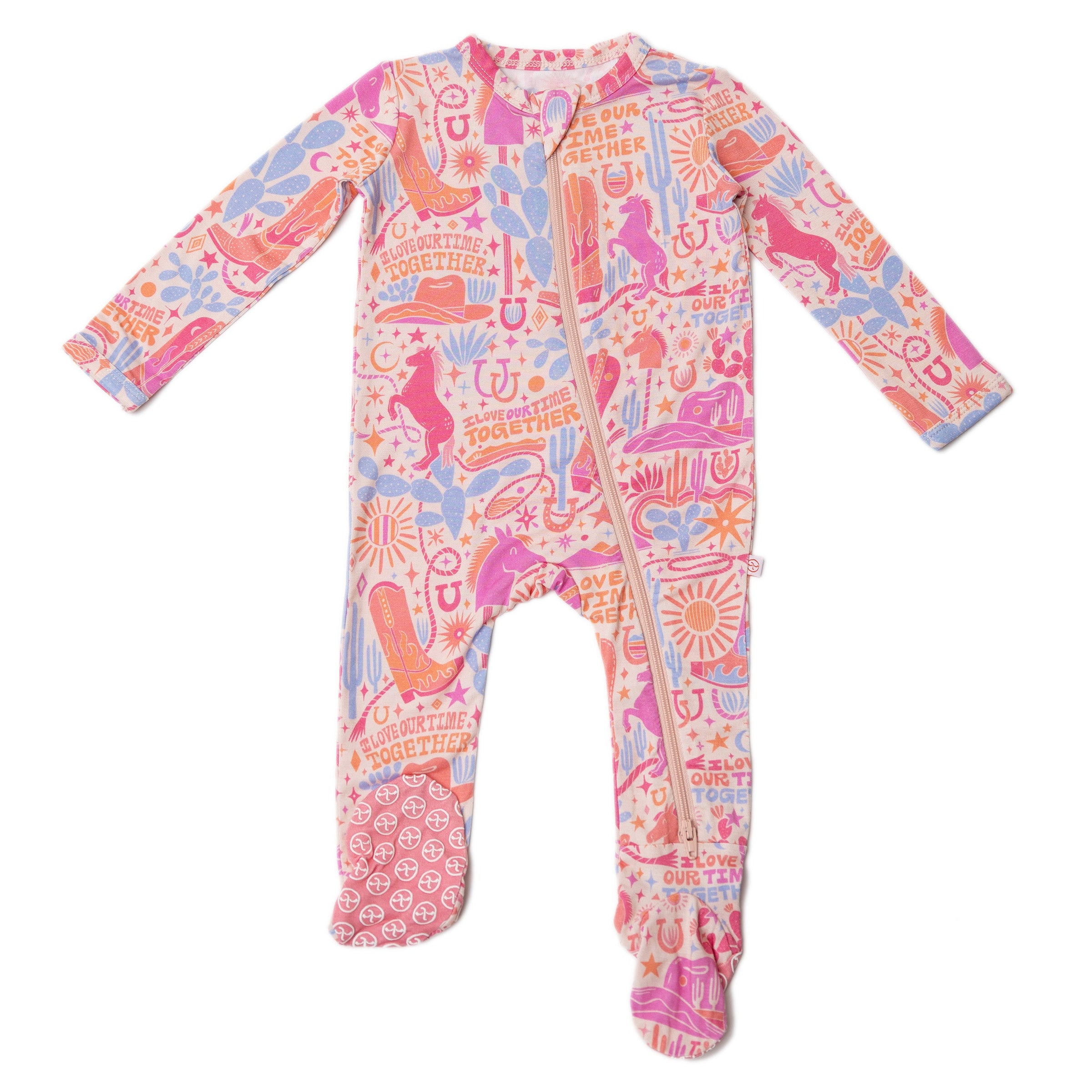 Introducing the Second-Skin Footie in the Saddle Up print. Designed for hardworking mamas (and dadas), this zippered one piece features an "I Love Our Time Together" affirmation, promoting love and gratitude. Made with ultra-soft CozyMama® viscose from bamboo, it offers 2-way zip, durable fabric, and larger openings for easy diaper changes. With Raising Mama® footie grips and fold-over mittens for sizes NB and 0-3M, it provides ultimate comfort and peace for both mama and baby.