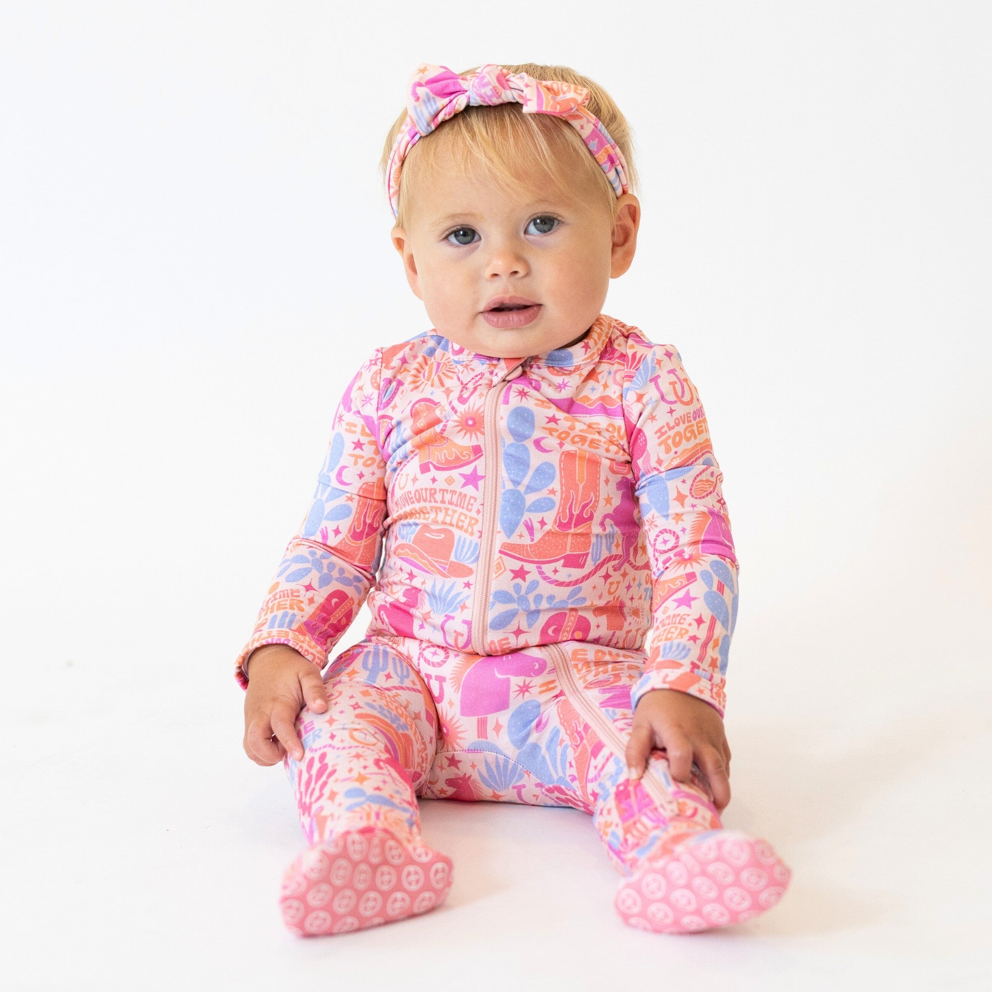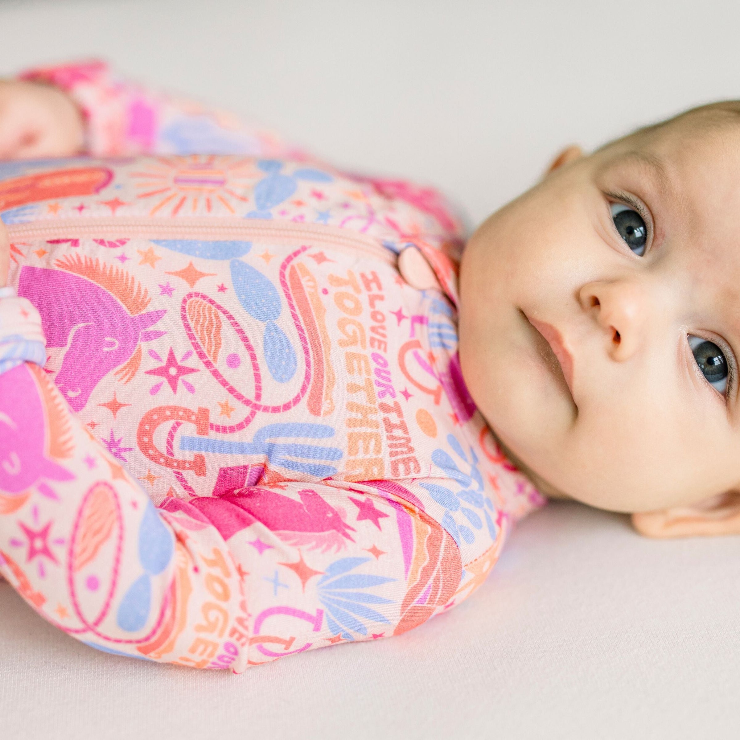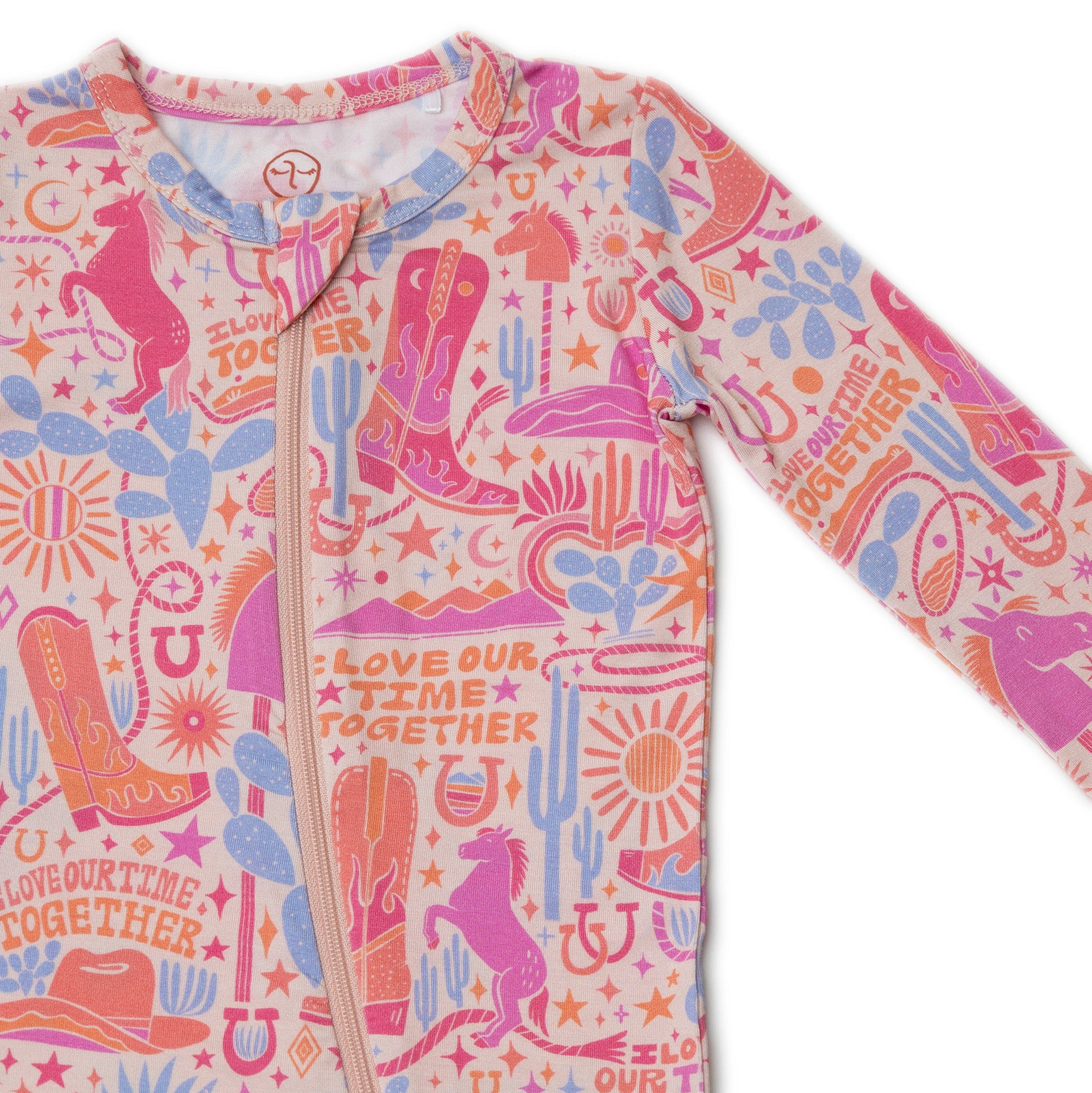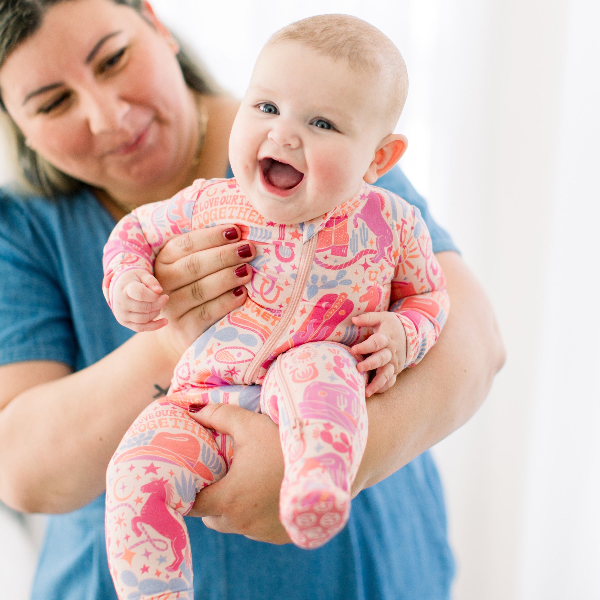 Introducing the Second-Skin Footie in the Saddle Up print. Designed for hardworking mamas (and dadas), this zippered one piece features an "I Love Our Time Together" affirmation, promoting love and gratitude. Made with ultra-soft CozyMama® viscose from bamboo, it offers 2-way zip, durable fabric, and larger openings for easy diaper changes. With Raising Mama® footie grips and fold-over mittens for sizes NB and 0-3M, it provides ultimate comfort and peace for both mama and baby.