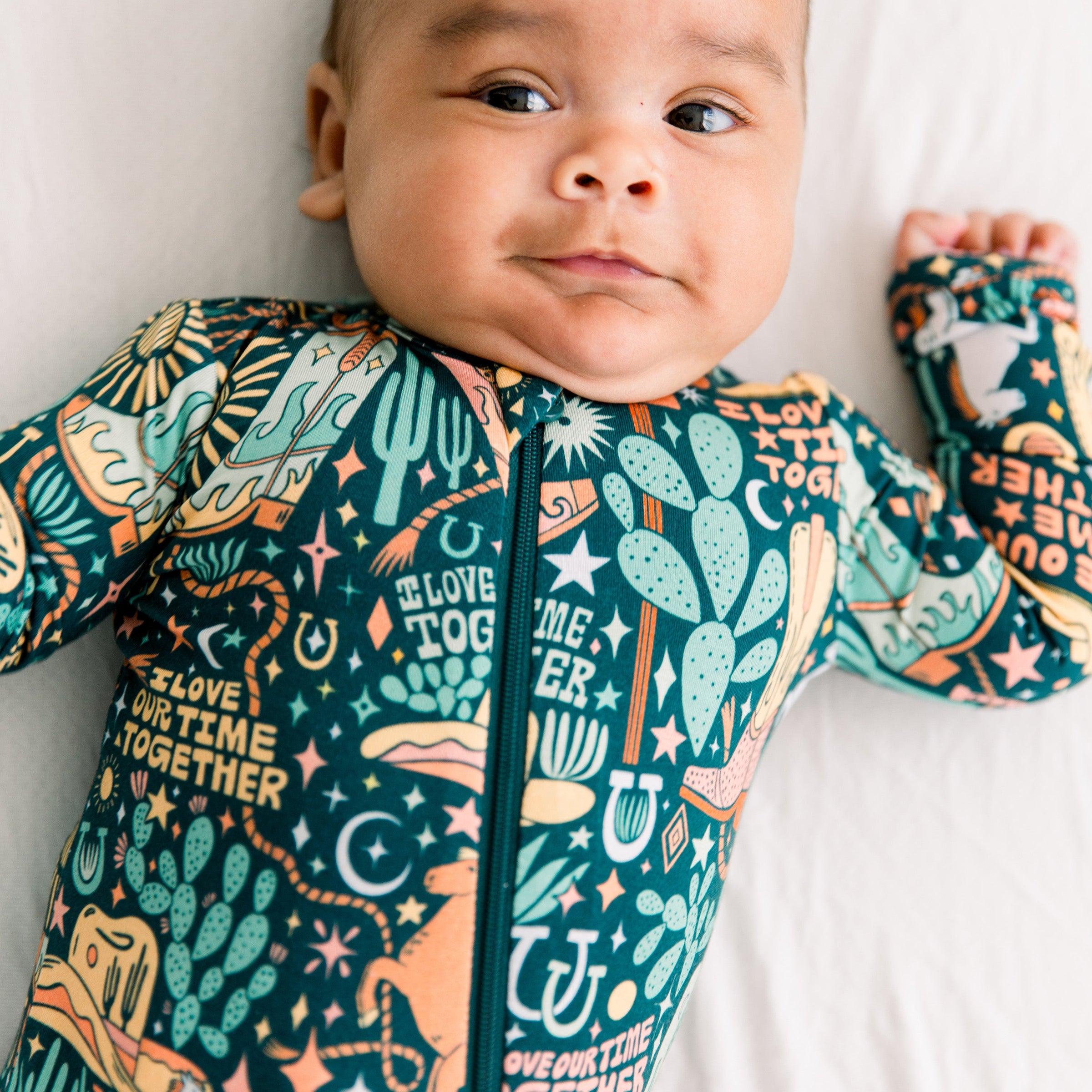 Introducing the Wild West Second-Skin Footie—a celebration of those magical moments between parent and baby! This thoughtfully designed zippered one-piece features a bespoke, hand-drawn print showcasing the affirmation "I Love Our Time Together," a gentle reminder to embrace gratitude, love, and belonging during those precious early days. Crafted from luxuriously soft CozyMama® viscose from bamboo, this footie pajama is your go-to for round-the-clock comfort.Â