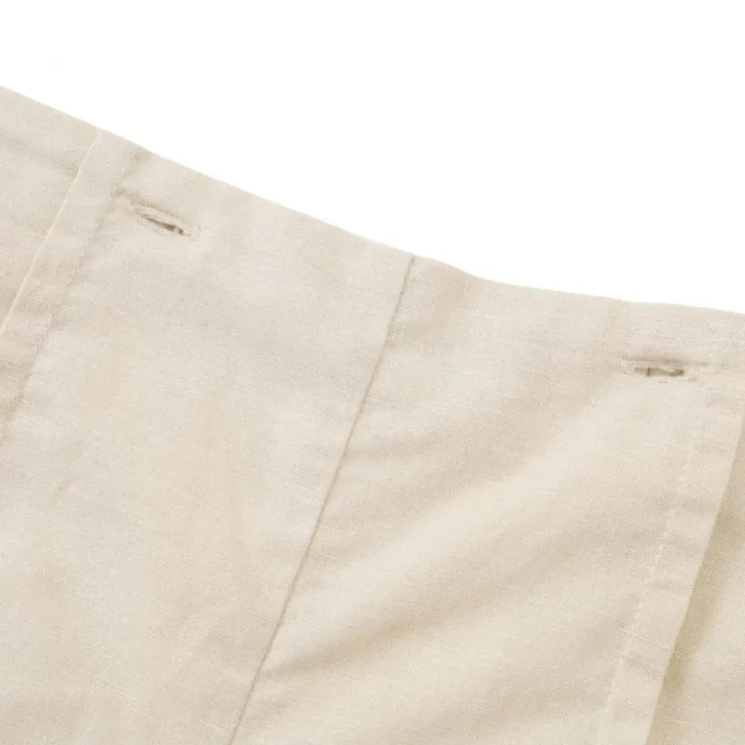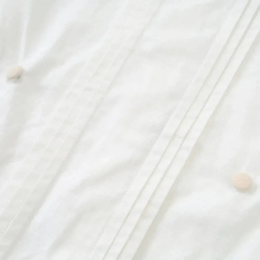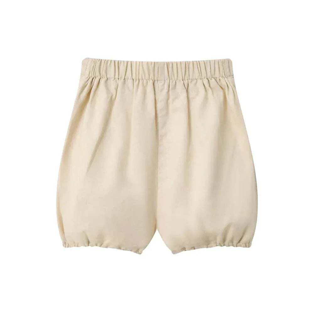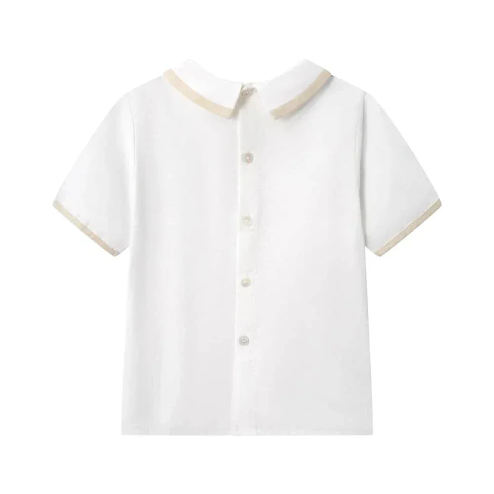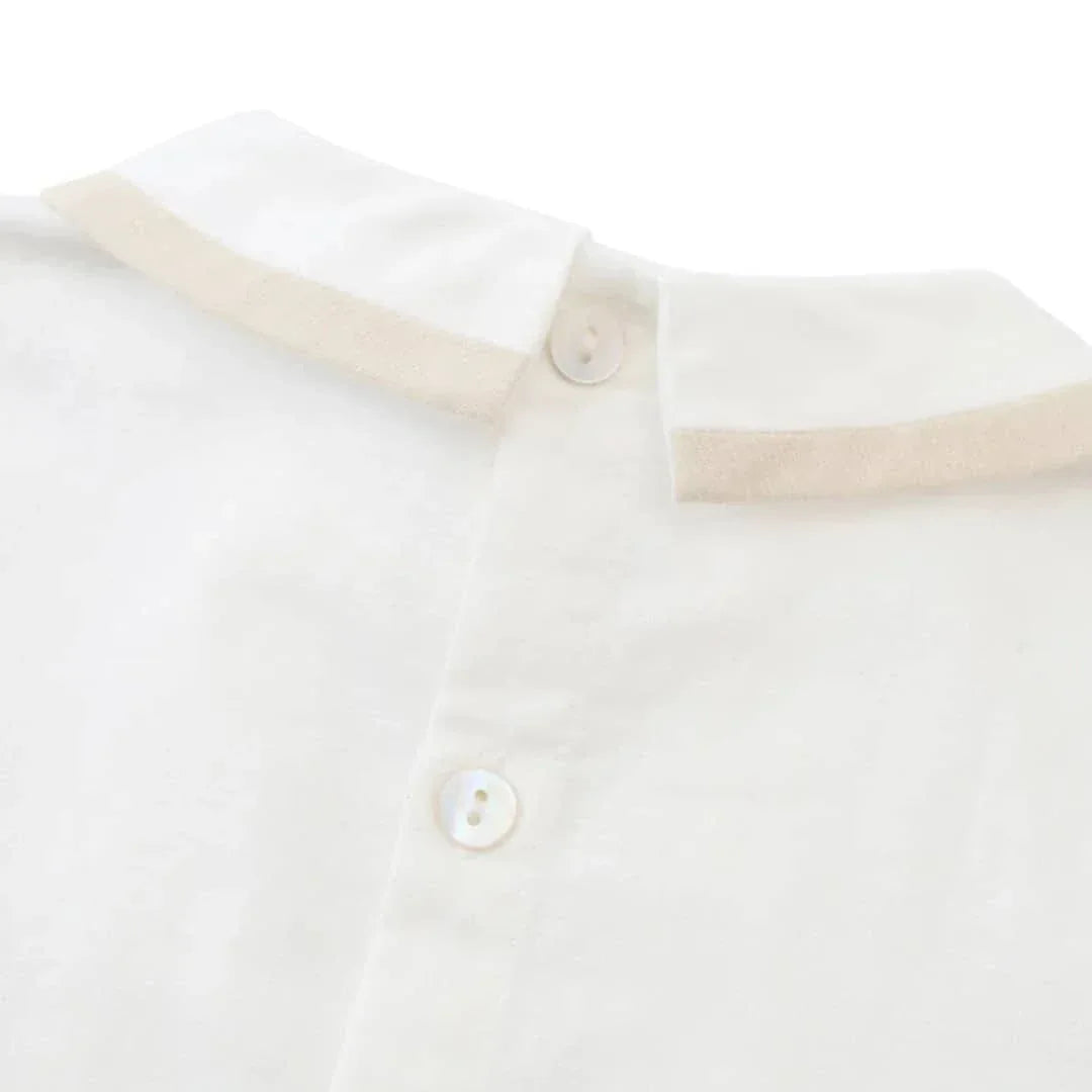 Choose from two classic colors, beige or light blue. Both options give a timeless look. The crisp short sleeve shirt has a tailored collar and subtle pleat details. Coordinating shorts have practical button accents at the waistline. The unique design is both formal and playful.
