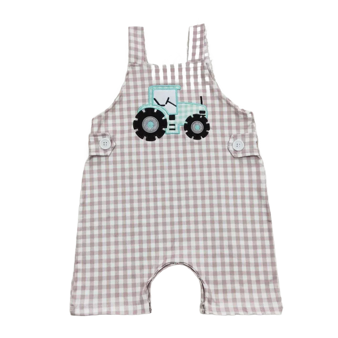 The chic beige and white plaid design enhances the overall look, effortlessly blending with other wardrobe pieces. Buttoned shoulders provide an adjustable fit, ensuring your little cutie has room to grow. Whether it's for playdates, birthdays, or family outings, this embroidered tractor romper is sure to turn heads and make cute memories.