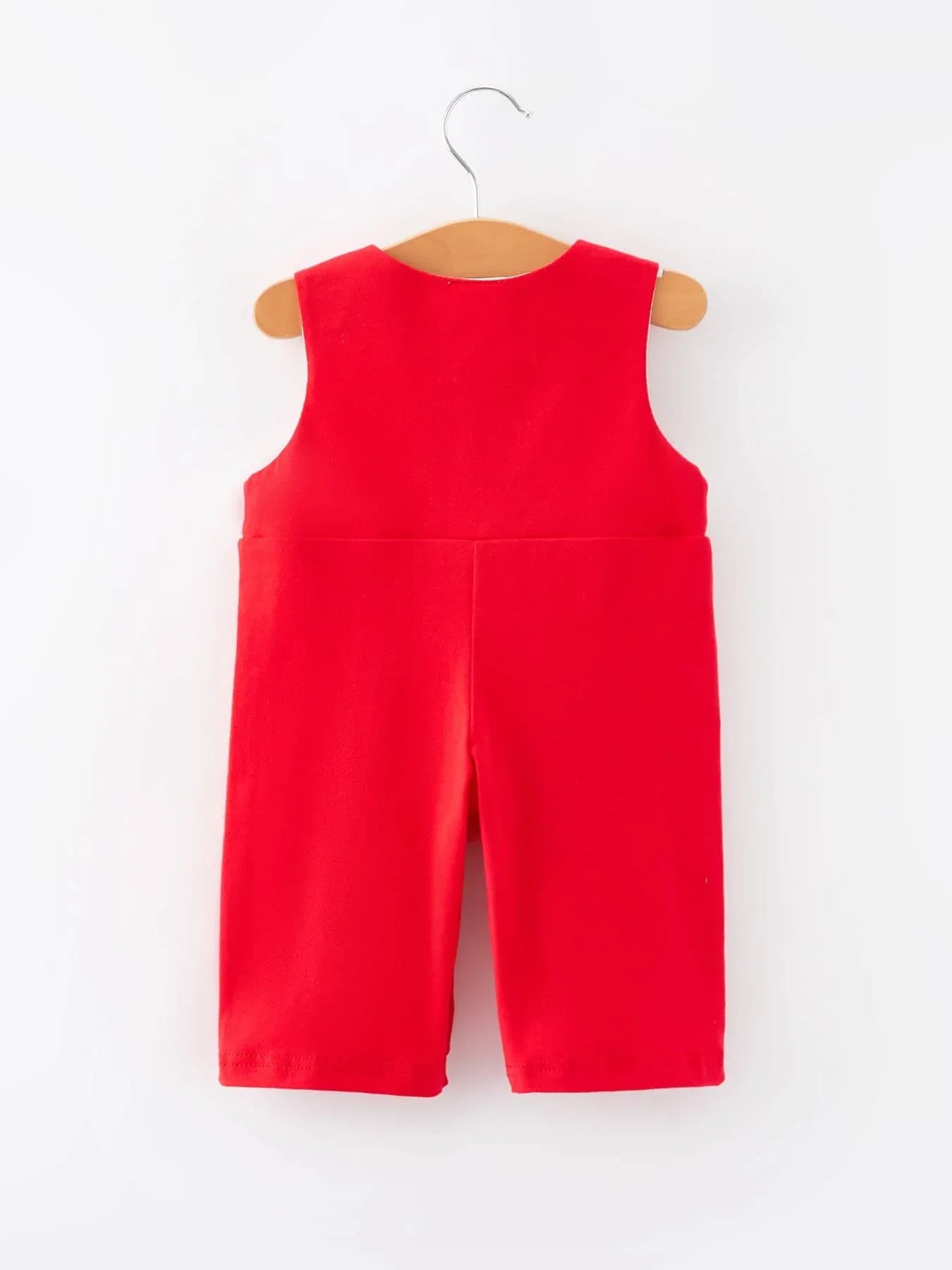 The Valentine's Day boys romper uses soft, comfortable fabric. The brilliant red color matches the holiday’s cheerful spirit. Easy shoulder buttons help with quick changes. Gentle snaps at the bottom allow for simple diaper swaps. The playful embroidered dogs and hearts create a gentle, joyful look.