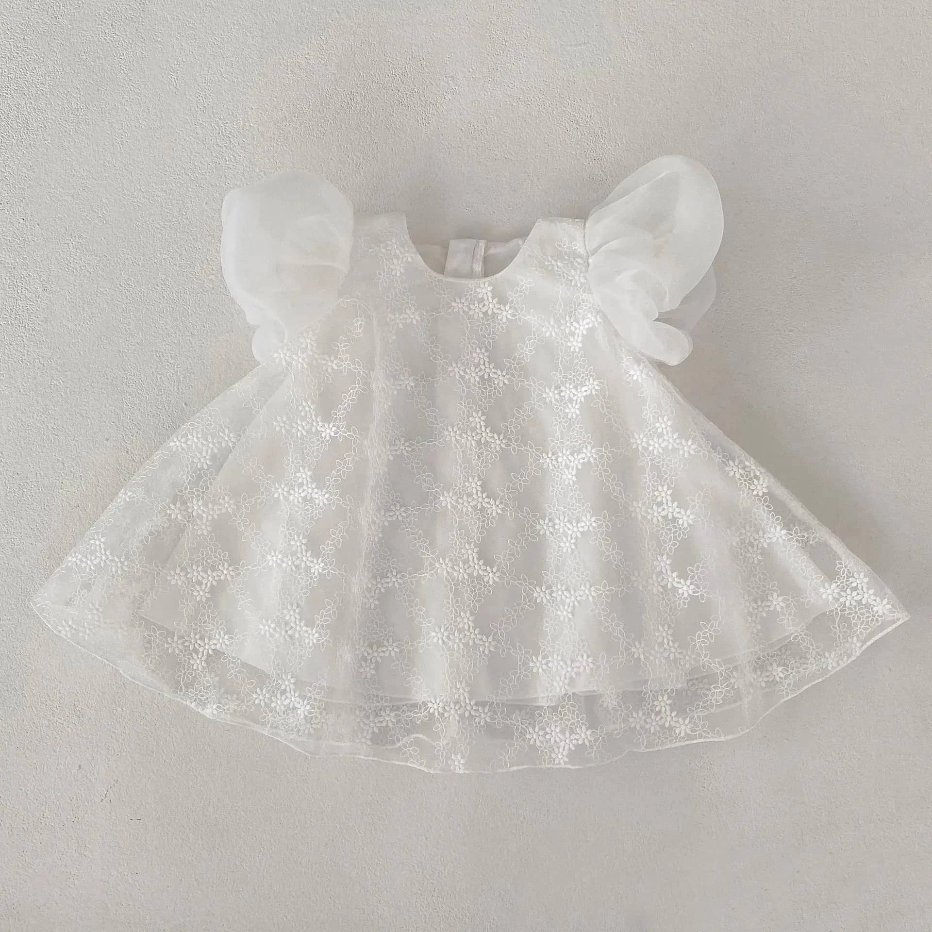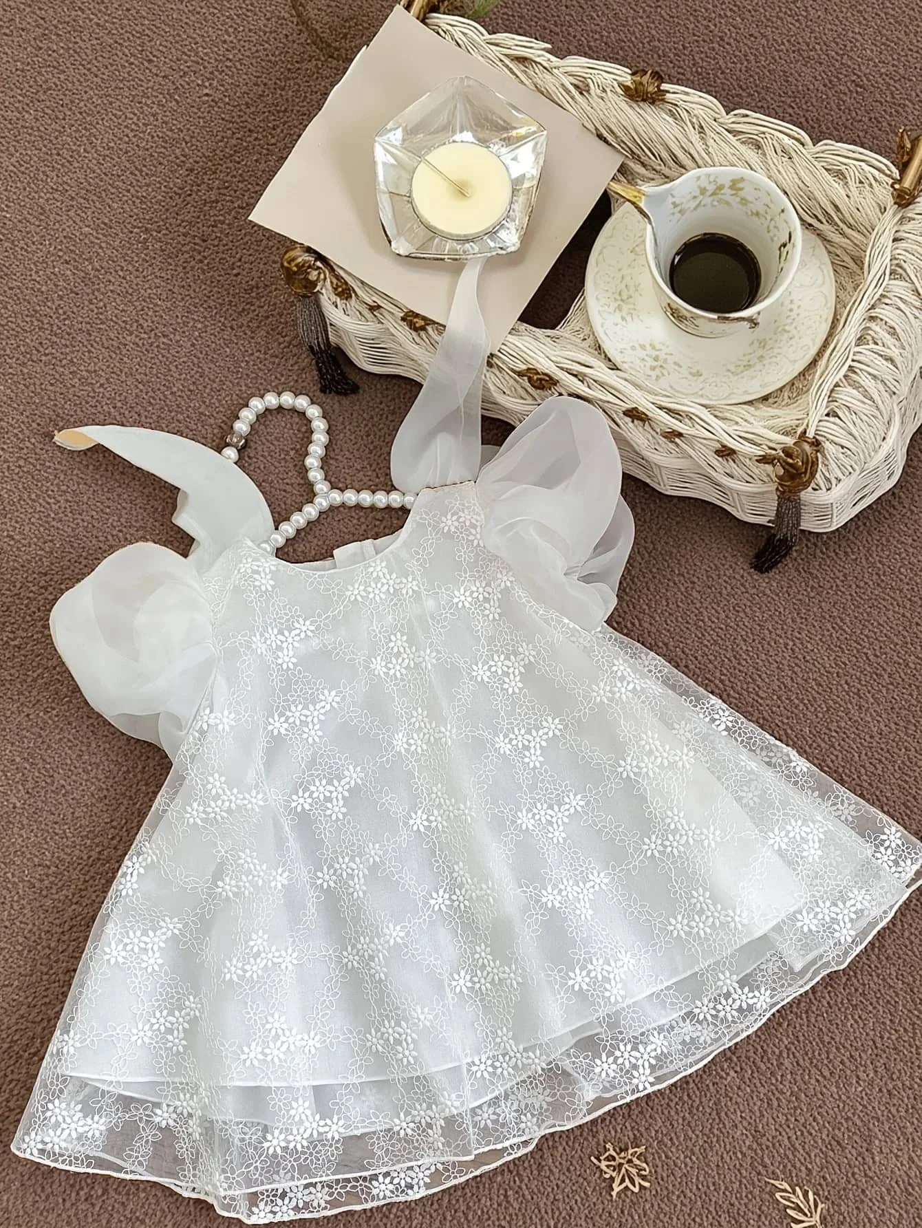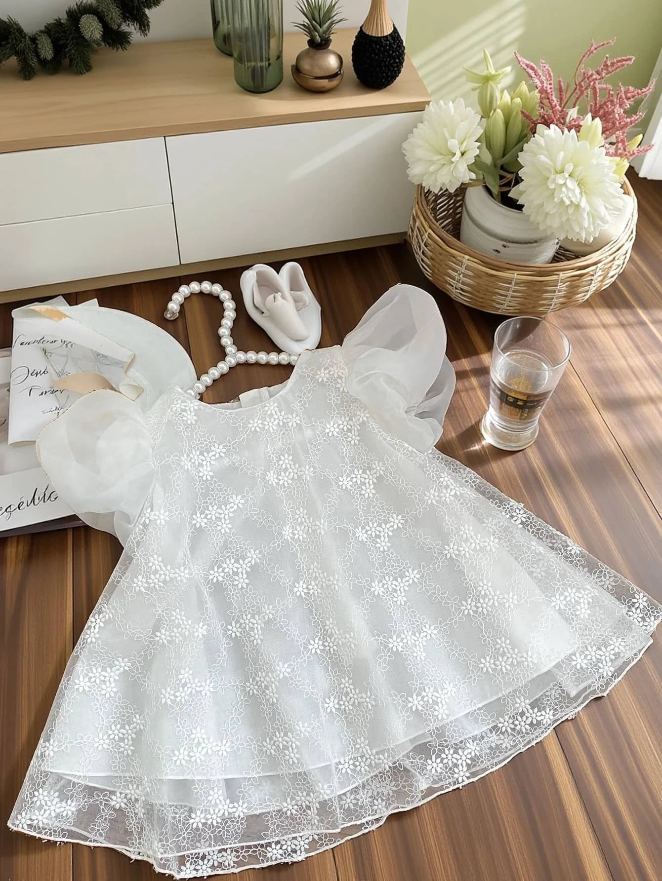 White Tulle Baby Dress with Floral Design & Puff Sleeves