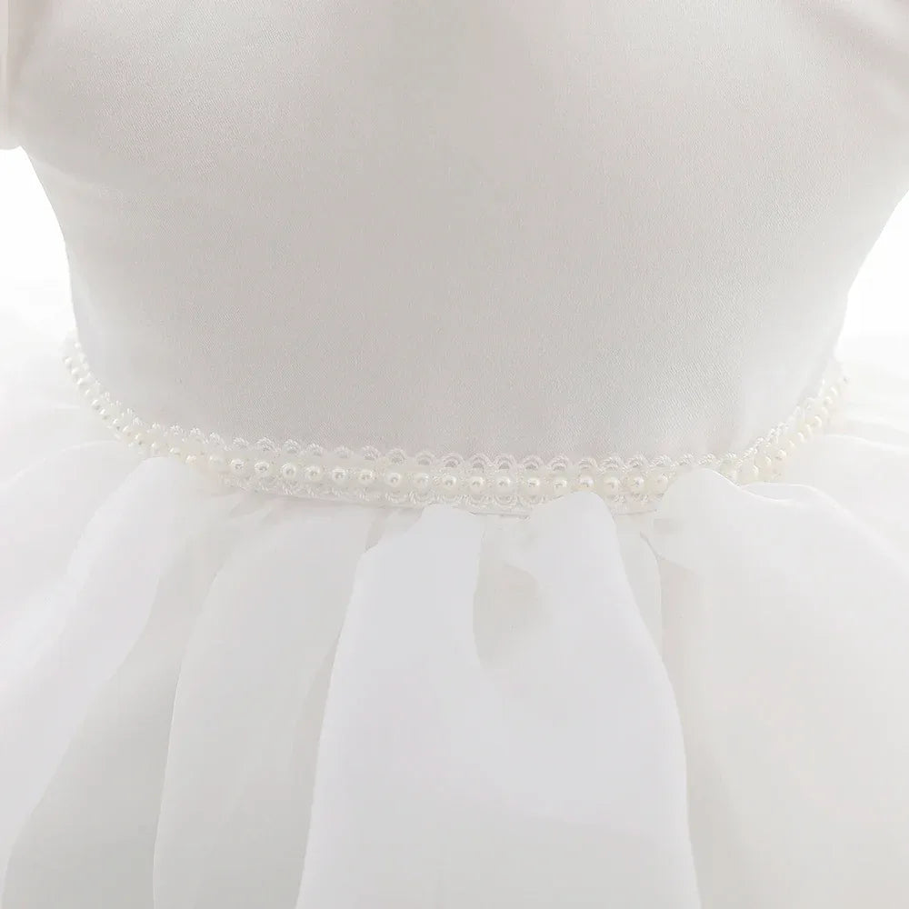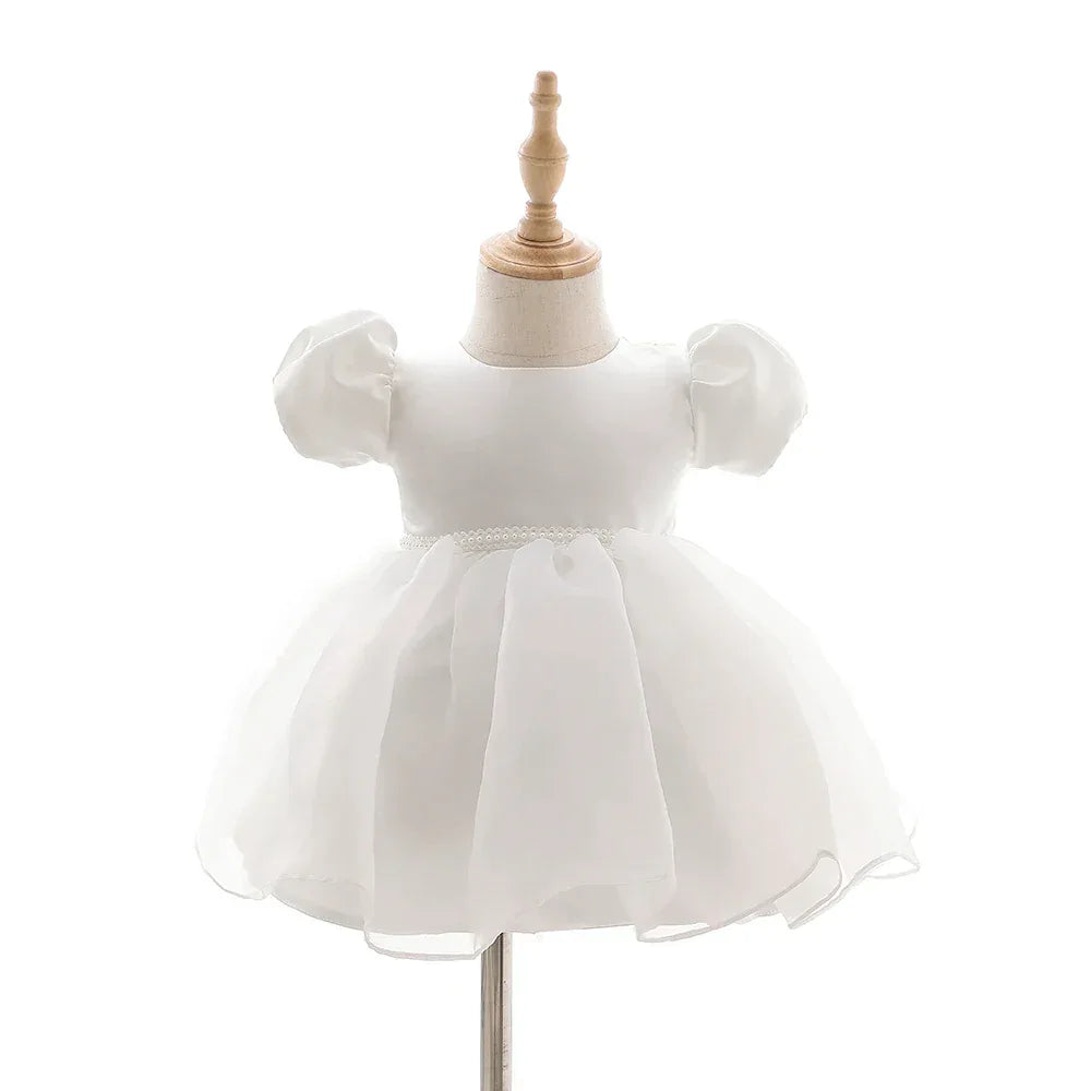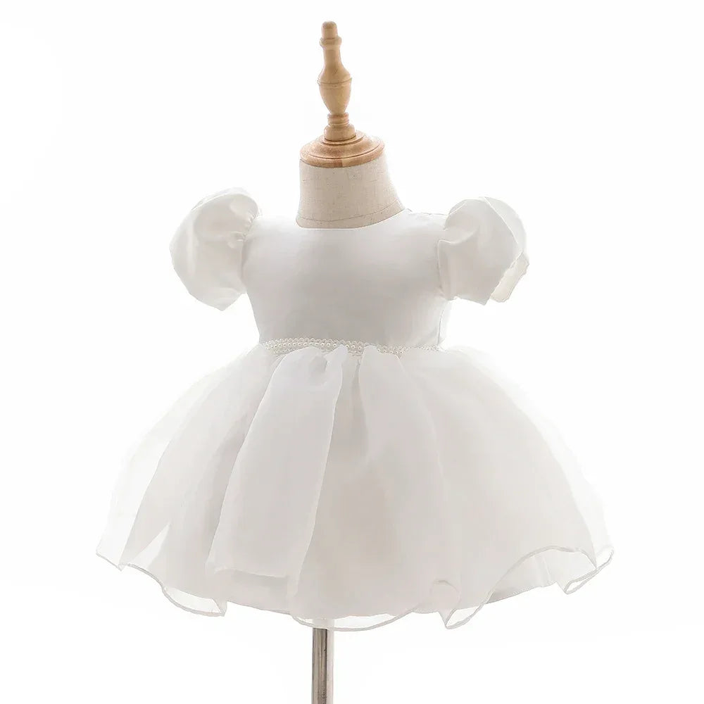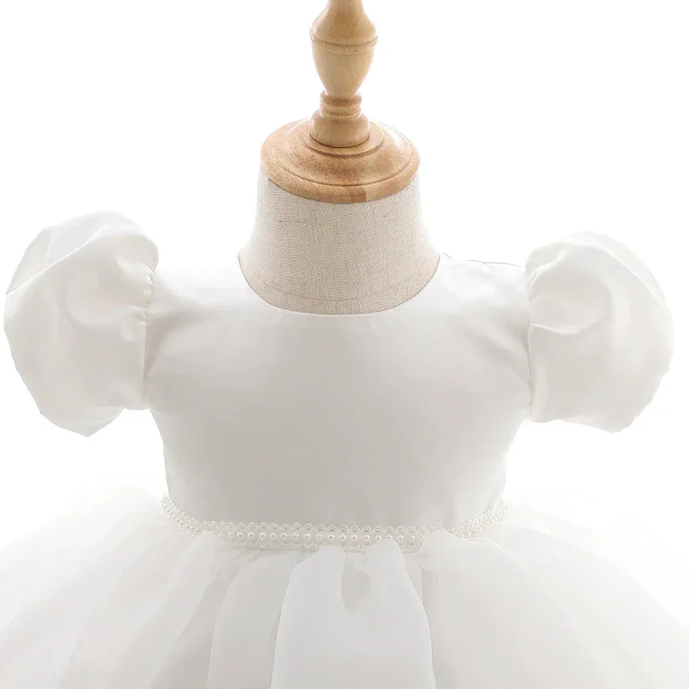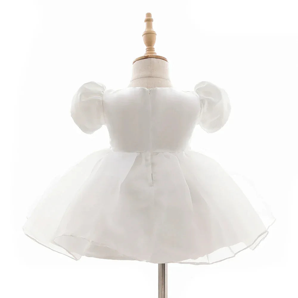White Baby Girl Tulle Dress with Puff Sleeves, Newborn-24 Months