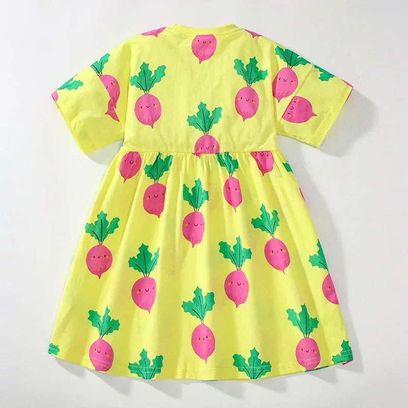 'Little Cutie' Fun Print Dress for Girls - Sunny Yellow with Pink Radishes