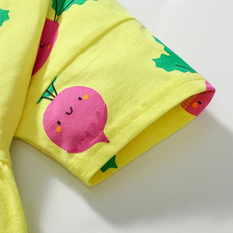 Looking for a playful dress that makes your little one smile? The “Little Cutie” Fun Print Dress for Girls is for you. This yellow radish print dress for girls brings cheerful vibes all around. The sunny yellow color pops, while the bright pink radish designs add a cute and quirky style.